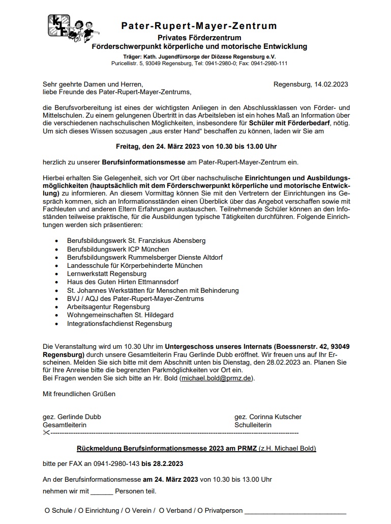 Die Veranstaltung wird um 10.30 Uhr im Untergeschoss unseres Internats (Boessnerstr. 42, 93049 Regensburg) durch unsere Gesamtleiterin Frau Gerlinde Dubb eröffnet. Wir freuen uns auf Ihr Erscheinen. Melden Sie sich bitte mit dem Abschnitt im Anschreiben bis Dienstag, den 28.02.2023 an. Planen Sie für Ihre Anreise bitte die begrenzten Parkmöglichkeiten vor Ort ein.
